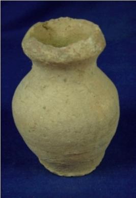| Description / विवरण | Coarse terracotta vessel, a small pot, with slightly broad mouth, broad inverted rim, short narrow neck, bulbous body and broad, flat and circular base. The rim is slightly broken. |