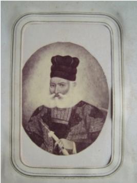 | Description / विवरण | In this photograph a person is sitting on a chair. He is holding a knife in his right hand. He has big moustaches and white beard. The person is well dressed |