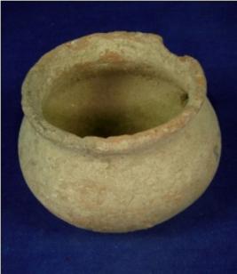 | Description / विवरण | Coarse terracotta vessel - a pot, with a broad mouth, short neck, bulbous body and circular, flat base. The rim is slightly broken and a hole in the middle of the body. |