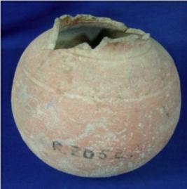 | Description / विवरण | Coarse terracotta vessel - pot having oval round base, round spherical body, rim is half broken. The body contains thick and averted rim. |