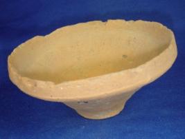 | Description / विवरण | Ill fired, shallow, terracotta bowl with inverted rim with carination, broad mouth, flared body and circular footed base. The rim is partially broken. |