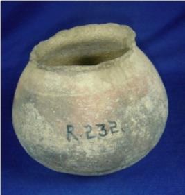 | Description / विवरण | Coarse, ill fired terracotta pot with oval base, bulbous body, broad and short neck with broken rim. Close striation marks are seen at the lower part of the body and one incised line is seen on the upper part of the body. A big hole is visible on the base due to breakage. |