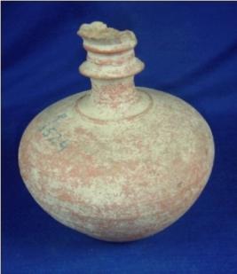 | Description / विवरण | Fine, red slipped terracotta pot with narrow flat circular base, round body which is slightly cracked and long double rimmed neck. The rim of the mouth is partially broken. It is coordinated on the upper part of the body. |