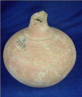 | Description / विवरण | Semi fine, red slipped terracotta pot with circular flat base, bulbous body, narrow neck and broken rim. Carnation mark is seen just below the neck. |