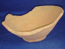 | Description / विवरण | Incomplete terracotta bowl with circular footed base, flared sides with fine corrugation on the bowl, large portion of the bowl is broken. |
