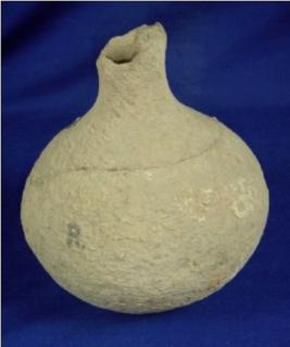 | Description / विवरण | Coarse, incrustation terracotta pot with oval base, bulbous body and long, narrow neck the rim of which is broken. |