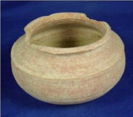 | Description / विवरण | Coarse, ill fired terracotta pot with oval base, bulbous body and narrow neck. upper part of which is broken. Circular incised lines are visible on the upper part of the body with carination mark. |