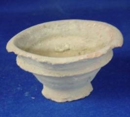 | Description / विवरण | Coarse, ill fired, terracotta bowl with circular, flat base, with a sharp carinated at the upper part and a slightly broken out turned rim. It is deep and carinated incised. |