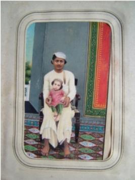 | Description / विवरण | This is a colour painting in which a man is sitting on a chair and holding a child on his laps. He is wearing white kurta, payjama and a topi cap and the child is wearing pink and green colour dress. The floor is having multicoloured tiles in criss-cross pattern. A wall painted in green and orange colour decorative pattern can be seen in the background. |