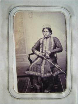 | Description / विवरण | In this photograph a person sitting on a chair. He is holding a stick in his right hand and his both arms are on chair-arm he is well dressed. He is also wearing a cap with broad border |
