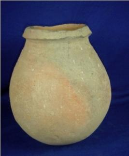 | Description / विवरण | Coarse terracotta vessel - pot, with broad mouth, broad, inverted rim, with concavity below, bulbous body and round base. The upper body has close striation marks. |