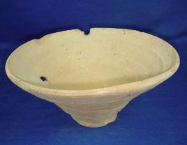 | Description / विवरण | Coarse terracotta bowl with flat circular base, flaring sided which is slightly flaked off and slightly inverted rim. Corrugated profile is visible on the exterior surface while the interior surface has sparse striation marks. A small hole is seen on the body probably due to breakage. |