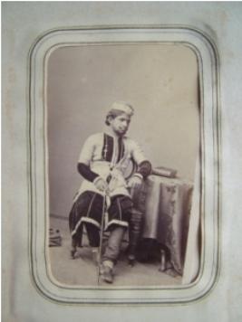 | Description / विवरण | In this photograph a person sitting on a chair. He is well dressed in white kurta. He is holding a stick and his left hand is on the table besides him carrying books. |