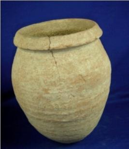 | Description / विवरण | Coarse terracotta vessel - a pot, with broad mouth, broad, inverted rim, with concavity below, round body and irregular base. The body has sparse striation marks. The rim has a crack. |