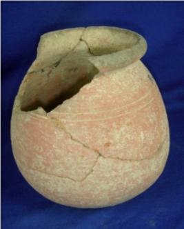 | Description / विवरण | Coarse terracotta vessel - pot, with broad mouth, rim with concavity below, bulbous body and round base. The body has three striation marks on the upper part and rim is broken. It was broken into several pieces but later restored. |