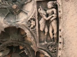 | Description / विवरण | It is an Fragment of Architectural Member showing a flower in center and two male figures sitting around it. At the right side upper part of male figure is broken, other details are not very clear. Stone is becoming black. |