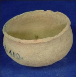 | Description / विवरण | Plain terracotta vessel, probably used as bowl. It has a broad mouth, round body and oval base. A small crack is running from the rim to the body. |