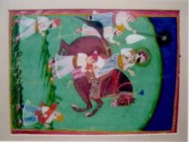 | Description / विवरण | The painting depicts a halo King seated on an oversized fully dressed red horse with attendants following him. There are three men in the foreground going along with him and in the background there are two men, one swinging chauri and the other holding chatra in their hands. The ground is painted green with high horizon in indigo blue. |