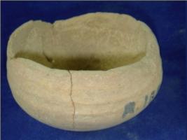 | Description / विवरण | Terracotta bowl with an oval base and a featureless rim which is cracked and slightly flaked off. Its inner surface is smooth while outer surface has sparse striation marks. |