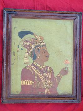 | Description / विवरण | It is a painting of Maharaja Pratap Singh. He is shown with a decorated turban, red kurta, and richly ornamented. He is holding a lotus in his hand. It is mounted in a frame. |
