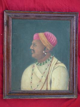 | Description / विवरण | This is a painting of Raja Man Singh. He is shown in white kurta, necklace, earing and pink and yellow colour turban. It is mounted in a frame |