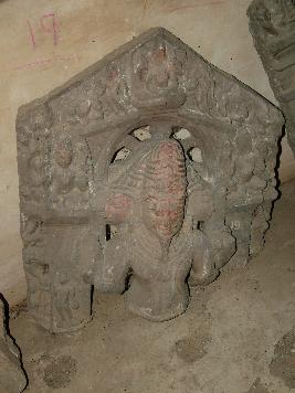 | Description / विवरण | It is an image of Brahma, it has three head. The front one is prominent with beard. He has ornate jatamukuta. Behind his head a halo is carved around Makar Parikar . Figures of Gods Siva Vishnu & Brahma and human are carved Due to defaced they are not identified . The lower part of the image is missing. |