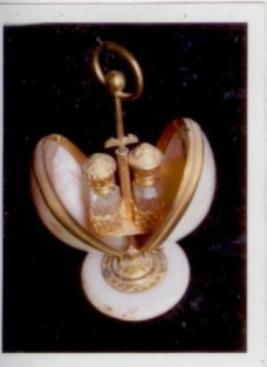 | Description / विवरण | This scent case is in oval shape like egg it is open by pressuring a metal knob. After operating, it open in two parts. In the center two bottles are beached. These all are joined with metal spring, which is fixed on a circular flat base, made of stone. |