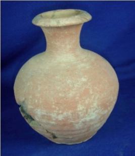 | Description / विवरण | Coarse terracotta vessel - small pitcher, with broad, out turned rim, slightly long and slender neck, round body and circular flat base. The lower part of the neck has a striation mark. The mouth and the lower body are broken into several pieces, but restored. The base and lower body has three large holes. |