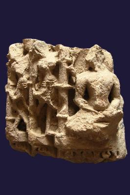 | Description / विवरण | This architectural piece is carved with a male deity flanked by two female attendant on either side. The main deity is in padmasan. Identification is difficult since the images are defaced and broken. They all are in tribhangi posture and placed in separate niches. |
