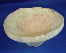 | Description / विवरण | Coarse, ill fired terracotta bowl with flat circular base, flaring sides are slightly vertical rim which is slightly flaked off. Close striation marks are visible on both exterior and interior surfaces. |