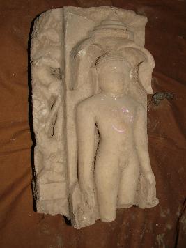 | Description / विवरण | This architectural fragment is having an image of Jaina who has been shown naked, curly haired with a bun. On the left side of the Jina, a Vyala mythological animal can be seen. Above the Jina conical shaped canopy is there. Legs of the Jina are lost now. |