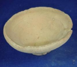 | Description / विवरण | Plain, coarse terracotta vessel - bowl with flared body, tapering end and flat circular base and mild carination marks. Clay incrustation all over. |
