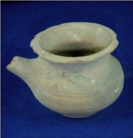 | Description / विवरण | Plain terracotta vessel - lota , with spout. It has a broad mouth, short neck, bulbous body and flat base. The spout is added at the upper body, with perforated hole. The rim of lota and the nose of the spout are slightly broken. |
