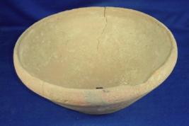 | Description / विवरण | Ill fired, wheel turned terracotta bowl, round and flat base, tapering towards base, rim is inverted and there is hole at the centre of the bowl. Earthly incrustation all over the body. |