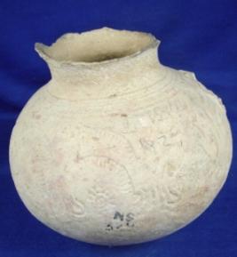 | Description / विवरण | Ill fired, terracotta sprouted pitcher, the base is round, body is round, striation marks on the waist portion, rim is averted but upper rim is broken. Incised lines in circular pattern are designed on the body. |