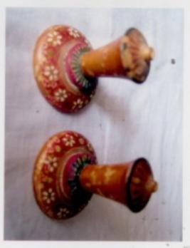 | Description / विवरण | 2 no s of Chessman camels in ivory with a broad pedestal base and projecting ring just above the base. It has a narrow body having broader upwards and a small nob at the top. It has floral decoration in golden and white over the red coloured base Upper part is painted in golden colour. |
