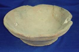 | Description / विवरण | Coarse, ill fired, terracotta bowl, flat pedestal, base flared body, shallow depression in the middle. It is broken and restored. |