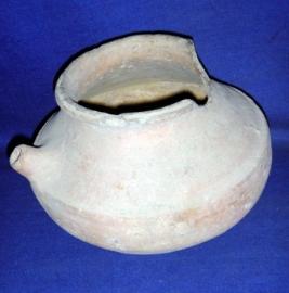 | Description / विवरण | Semi fine terracotta spouted pot with averted thick rim, narrow neck and a spout is seen on the upper part of the bulbous body and oval shaped base. |