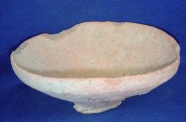| Description / विवरण | Coarse, ill fired terracotta bowl on a footed base with flared sides and vertical rim. There are close striation marks on the interior surface. Edges of the rim are broken. |