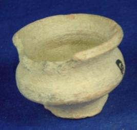 | Description / विवरण | Incomplete and ill fired small pot having circular flat base, bulbous body, high neck, broad mouth with averted rim. It has clay incrustation on it There is a hole at the bottom due to breakage There are sparse striation marks in the interior surface. |