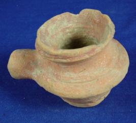 | Description / विवरण | Miniature spouted pot, coarse, with averted broken rim having carination marks, circular carinated body and circular flat base. |