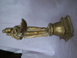 | Description / विवरण | Deep Sachika Woman with a lamp standing on a pedestal base with engraved decorations. The woman is long legged wearing a decorated dhoti like cloth and jewelleries holding a big dia lamp with both of her hands. |