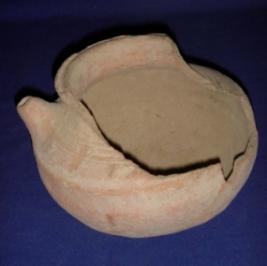 | Description / विवरण | Plain, terracotta Miniature pot with broad mouth, flaring rim, low neck, bulging body and round base. It has ridge on the rim, carination at the waist and a short spout above the carination. Large part of the rim and body are broken. A piece of the body is retouched. |