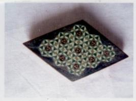 | Description / विवरण | This is an art object of diamond shape. It is decorated with intricate geometrical and floral design of black, brown, green, and white colours. The floral designs are carved inside a hexagonal frame. All are placed inside a white colour border on wood. |