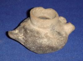 | Description / विवरण | Coarse terracotta vessel, Miniature pot with oval base, bulbous body, highly carinated waist, low neck and narrow mouth. The rim is featureless and slightly broken. The body has two broken spouts on one side and other side has inched handle with perforation. It was ill fired and probably used as oil container. |