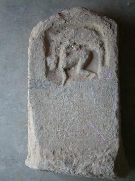 | Description / विवरण | It is a memorial stone dated 1190 A.D. In upper portion one deity in human form along with an animal figure has been carved out and in the middle and lower portion Devnagari scripts have been inscribed. Topmost portion is in semicircular shape. |
