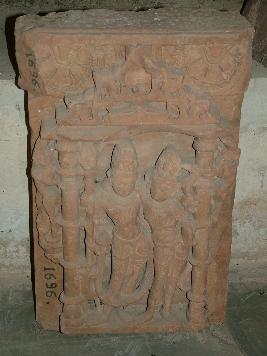 | Description / विवरण | This Fragment of Architecture member is carved with Shiva and Parvati in Tribhangi posture . They have Jatamukuta, left hand of Shiva is on the shoulder of Parvati, Trident is in right hand of Shiva. On either side there are Vyala. At the top it is carved with floral motifs with puspa mala flower garland |