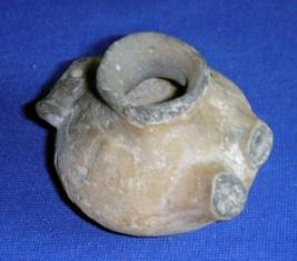 | Description / विवरण | Ill fired, handmade terracotta Miniature pot, with flat circular base, bulbous body, narrow neck and slightly averted rim. At one side of the body, two spouts are seen while the opposite side has a short knob having a hole on it. |