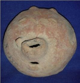| Description / विवरण | Boar face shaped terracotta spouted pot, bulbous in shape, with cleft lips and broken nose, probably used as spout. Its one tusk is visible and eyes are distinguished with incised lines. Its horns are also visible. Its outer side is red and core is black, hence it is ill fired. |
