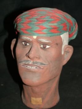 | Description / विवरण | Head gear or turban tied on the head made of paper mache , of a Saraogi Baniya, a Jain merchant. It is in red and blue, cotton cloth. |